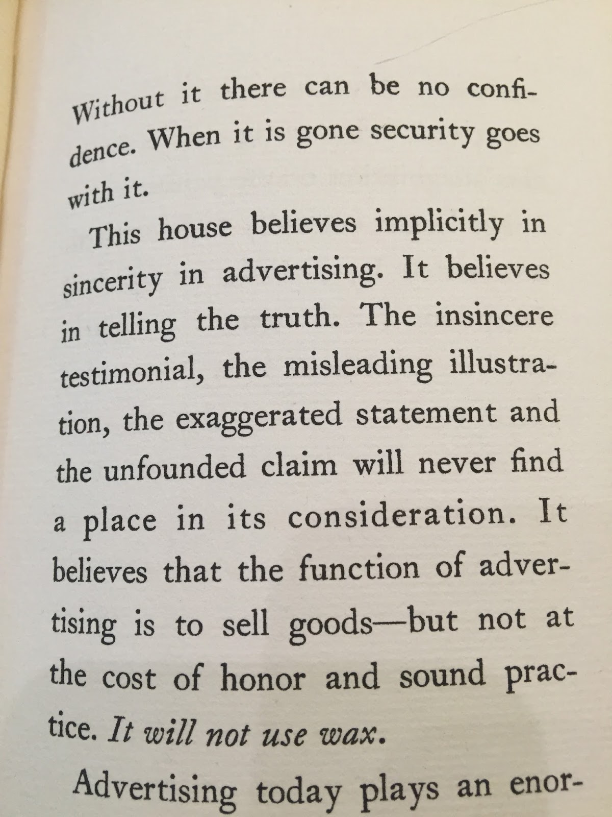 By now, we know we don't need to click on the link showing a Special Forces solider waterboarding himself to know he didn't do it anywhere near the number of times applied to a terrorist suspect, making his experiment worthless. A single pin prick might not constitute torture, but a hundred pin pricks without a definite end date is a different matter. The lesson: a country without firm principles will flounder and eventually fade away because any approach becomes justifiable. I will end with words on sincerity, misleading thoughts, and exaggerated statements from In Behalf of Advertising (1929):